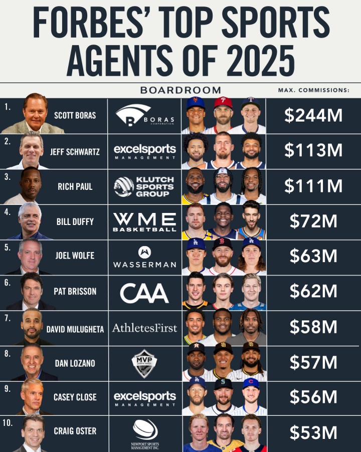 08月13日讯 《福布斯》公布2025年体育经纪人的佣金榜单,其中最为我们熟知的里奇-保罗仅排名第三。