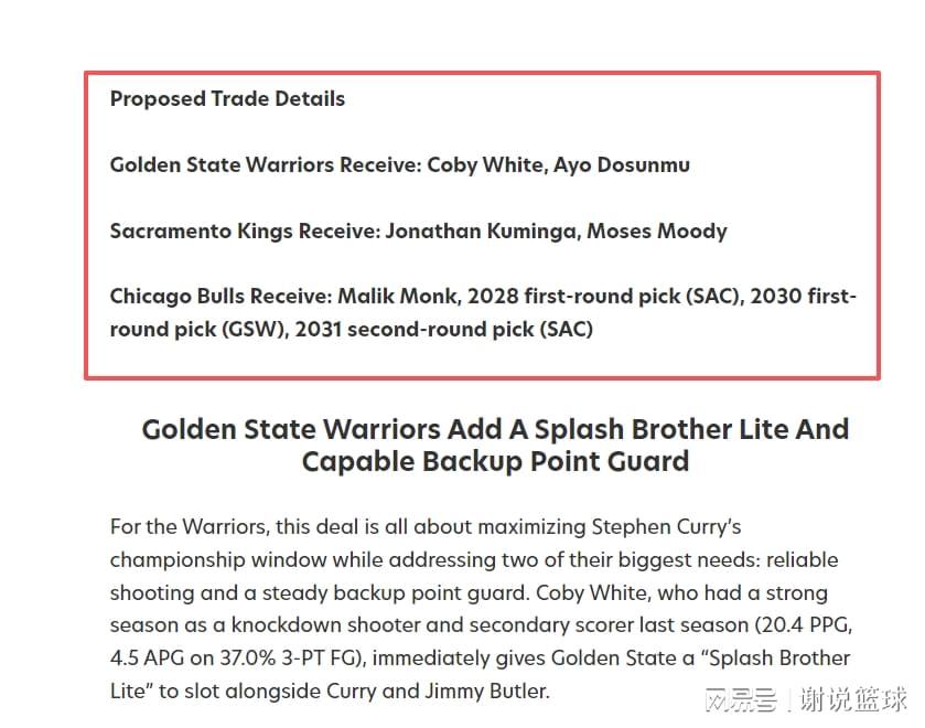 媒体FW就策划三方交易,勇士再追两后卫,包括科比-怀特和阿约-多森姆。而两名侧翼小将,库明加和穆迪则一起前往国王,公牛作为第三方,前湖人超六蒙克东游,他和两个未来的首轮签,会一起送到芝加哥,再加上2031年的次轮选秀权。