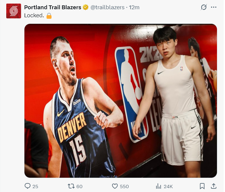 开拓者官方晒出约基奇海报与杨瀚森入场照的对比图。