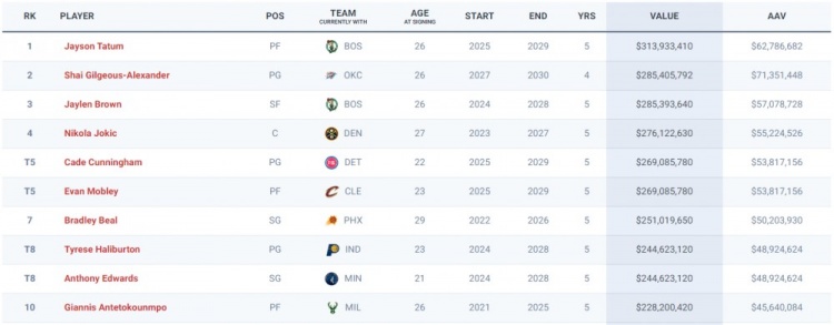 根据数据统计,亚历山大这份合同是NBA历史金额第二大的合同,仅次于塔图姆2024年签下的5年3.14亿。